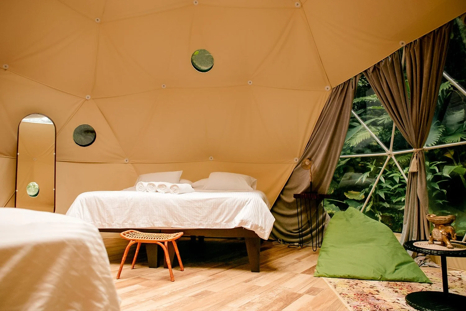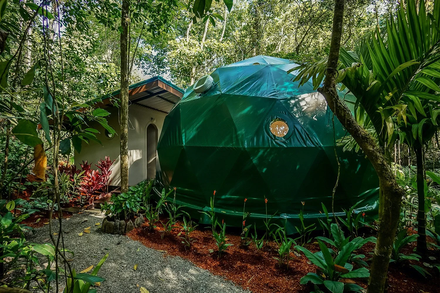 Inspired by sacred geometry, our 6 Geodesic River Domes, sits in the rainforest along the edge of our private river. Enjoy the soothing sounds of the flowing water paired with the vibrant sounds of the jungle.